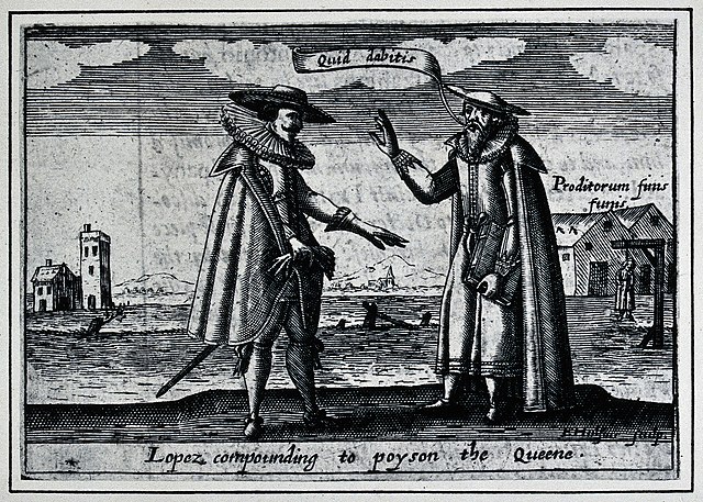 But Philip was, of course, very interested. He sent Lopez an emerald ring as a token of his willingness to pay for action. Lopez, sensing the chance to do some good for his adopted country and for himself, began to discuss more openly what a plan to kill Dom Antonio, the Earl of Leicester (or Essex after Leicester’s death in 1588) or the Queen herself might look like. He was successful to the extent that Philip actually sent the money to await collection when Elizabeth was successfully poisoned.